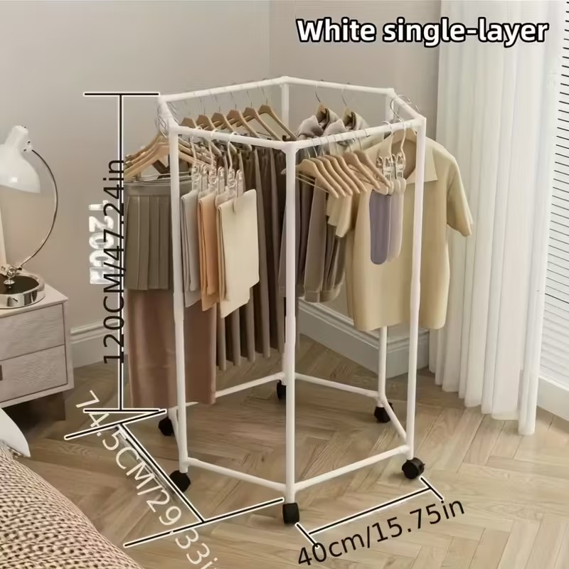 Upgrade your storage setup with this hexagon rotating garment rack—a sleek organizer designed for convenience and style. Its 360° rotating frame and smooth-rolling wheels make it easy to access and display clothing from any angle. Built with a sturdy metal structure, this rack is ideal for laundry rooms, boutique displays, or everyday home storage. Durable, portable, and thoughtfully designed, it offers a practical solution for organizing garments without taking up extra space.